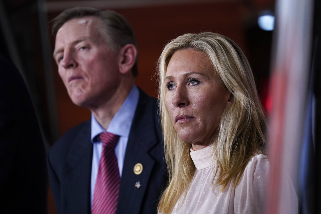Rep. Marjorie Taylor Greene, R-Ga., joined at left by Rep. Paul Gosar, R-Ariz., at the Capitol in Washington, Tuesday, Dec. 7, 2021. (AP Photo/J. Scott Applewhite)